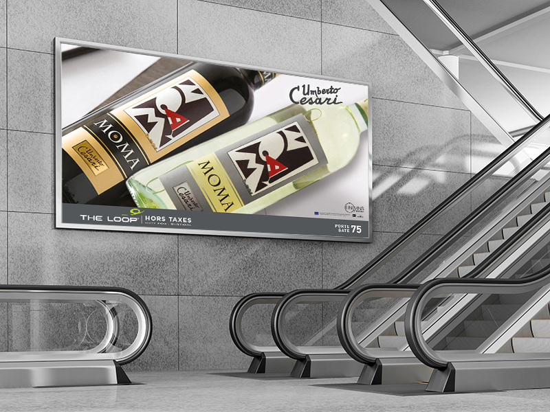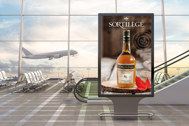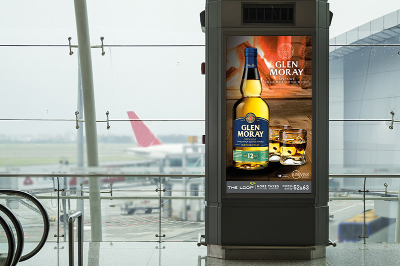 Publicités numériques à l'Aéroport de Montréal pour divers producteurs de vin et spiritueux